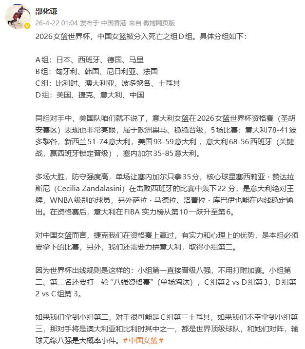 北京时间4月22日凌晨,2026年国际篮联女子篮球世界杯抽签在德国柏林揭晓,中国女篮被编入D组配资专业炒股配资门户,同组劲敌包括卫冕冠军美国队、欧洲新锐意大利队和曾在武汉预选赛中败北的捷克队。外界普遍将这一小组称为“死亡之组”,出线前景严峻异常。