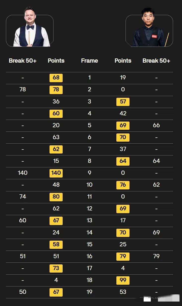 随后双方进入交替上分的拉锯战,第七局墨菲凭借精准的中远台得分,以62-37再夺一局;第八局范争一立刻回应,单杆打出64分,以64-15零封对手,双方战至4-4平。上半场收官战,墨菲迎来爆发,轰出单杆140分的破百高分,带着5-4的微弱优势结束上半场比拼。